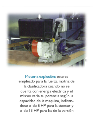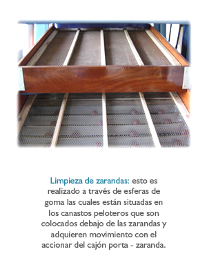 Es una máquina equipada para realizar la limpieza y selección de todo tipo de mercadería, para lo cual cuenta con un cajón porta-zarandas de 1 mt. x 2 mt. dividido en 3 ½ planos, lo que nos permite optimizar el tamaño (se realiza en un solo paso).
